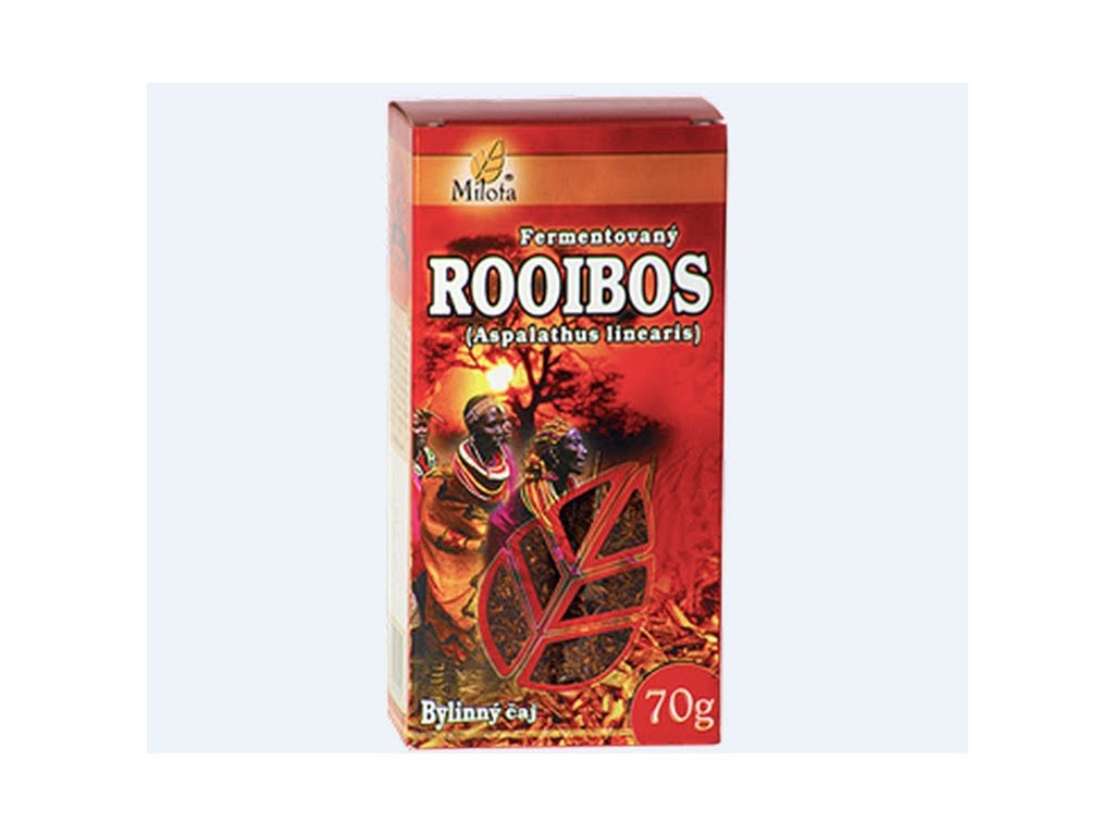 Složení: Aspalthus linearis herba. Rooibos je nápoj pro každou příležitost. Lze jej snadno připravit, pije se horký i studený. Droga obsahuje kvalitní třísloviny (4,5 až 6 % proti 8 až 15 % v černém čaji) a velké množství stopových prvků a minerálů – železo, měď, zinek, hořčík, mangan, draslík, vápník, fluor, molybden a další. Dále nacházíme látku zvláštní chemické povahy, zvanou aspalathin, velké množství flavonoidů, organické kyseliny, vitamin C a řadu jiných látek, jejichž výzkum pokračuje. Zároveň nemá žádné kalorie. Obsahuje jen nepatrné množství taninu, je mírně hořký a chutná i bez cukru. Skrze vysoký obsah minerálů a vitamínů obsažených v Rooibosu je vhodný k pití při fyzické námaze či nemoci, kdy je nebezpečí značného úbytku minerálů z těla díky pocení a zrychlené látkové výměně. Je tudíž vhodný zejména pro sportovce nebo nemocné lidi k doplnění minerálů a vitamínů přirozenou cestou. Zároveň nemá žádné kalorie - doporučuje se při hubnutí. Příprava: 1 čaj. lžičku přelijeme 0,25 l vroucí vody, vyluhujeme 3-5 min.