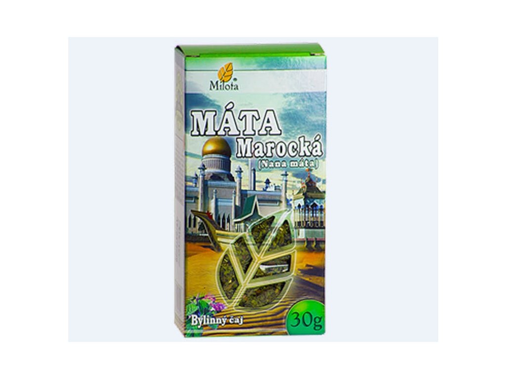 Složení: Marocká máta nať (Mentha spicata cv. Moroccan). Divoce rostoucí druh máty. Má velice osvěžující účinek, zejména v horkém letním počasí. Hlavní účinnou látkou je mentolová silice (s mentolem a jeho estery), dále zde nacházíme menton, sabinen, mentofuran, piperiton a konečně třísloviny, hořčiny a flavonové glykosidy. Užívá se jako léčivý čaj při onemocnění žlučníku a jater. Má příznivé účinky na nervovou soustavu, mírní bolesti, mírní žaludeční neurozy a zlepšuje i dýchání. Při kataru horních cest dýchacích můžeme s úspěchem využít aromaterapii, tedy formu inhalace. Výrazně se osvědčily rovněž mátové koupele a to při psychické labilitě, při revmatizmu a při některých kožních onemocněních. Silně aromatické máty dobře chutnají v moučnících a nápojích. Skvěle poslouží k ozdobení pokrmů. Mezi nejznámější koktejly patří Mojito.