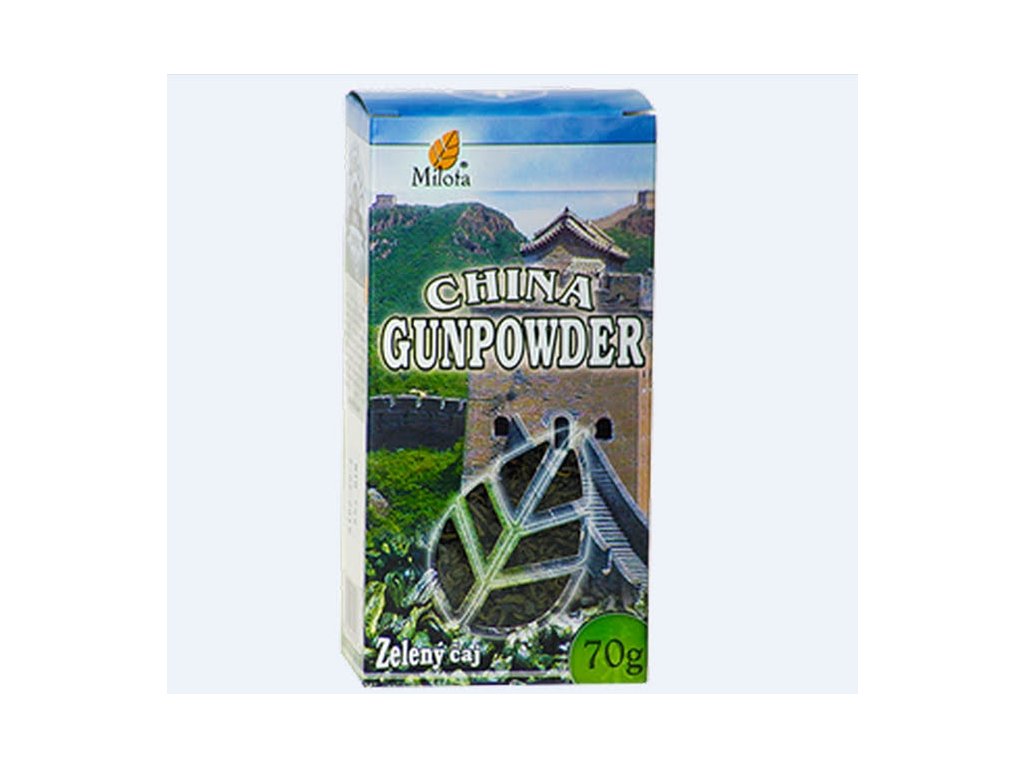 Složení: ču-čcha (camellia sinensis, perlový čaj, střelný prach). Legenda vypráví, že název Gunpowder (střelný prach) dal tomuto čaji mladý anglický obchodník s čajem, jemuž drobné, stočené zelené kuličky připomínaly střelný prach. Svým výjimečným zpracováním (sušením na dřevěném uhlí) a důkladným srolováním dostává tento čaj nezaměnitelnou chuť, aroma a maximální kvalitu, která ho odlišuje od jiných čajů. Po přelití horkou vodou se lístky pozvolna rozvíjejí. Vzniká silný, tmavě zelený nápoj nezapomenutelné vůně a nahořklé chuti, která však není nepříjemná a dlouho vydrží v ústech. Vývozci čínského čaje ho doporučují také k přípravě ledového čaje s citronem a cukrem. 10g Gunpowderu (dva šálky silného čaje) představuje 1-2 mg. fluoridu což je doporučená denní dávka.
